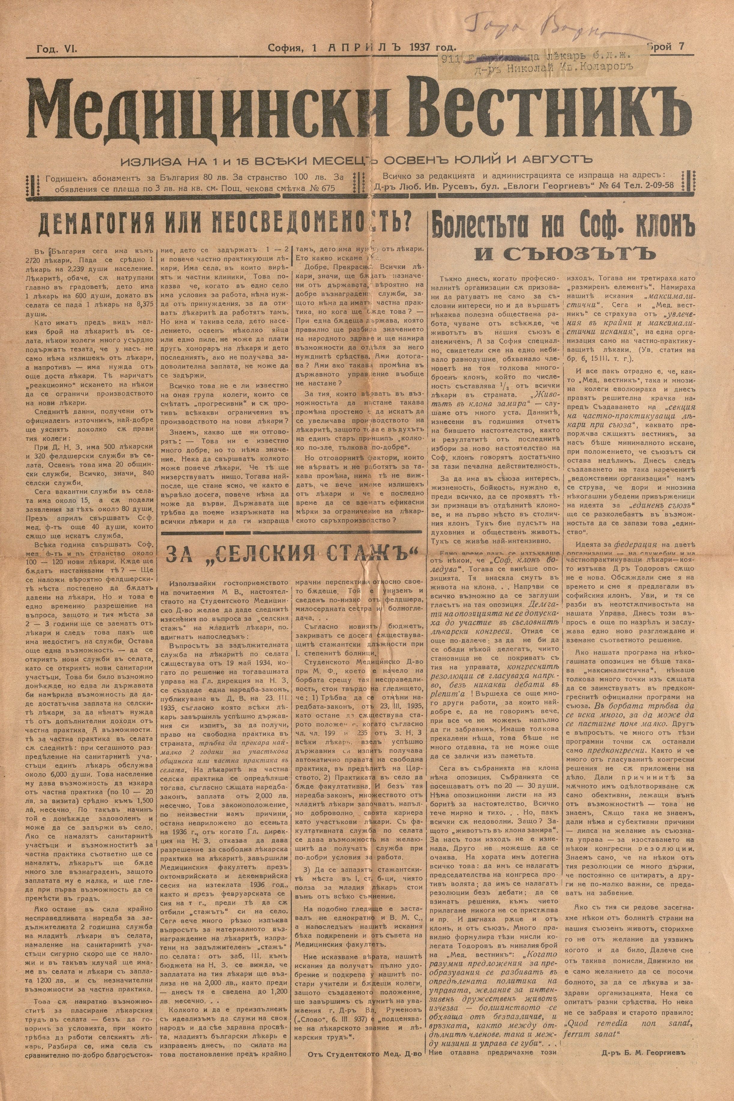 Медицински вестникъ, 1937 г., бр. 7 - 20